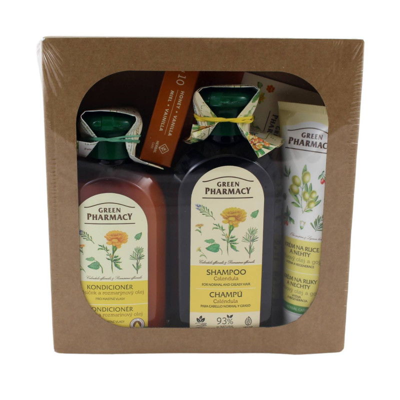 Darčekový set Green Pharmacy pre mastné vlasy robte radosť sebe alebo svojim blízkym perfektným kozmetickým setom Green Pharmacy pre mastné vlasy . Balíček plný vlasovej starostlivosti ako darček vždy poteší. Obsah sady: šampón pre mastné vlasy nechtík a rozmarínový olej 350 ml kondicionér pre mastné vlasy nechtík a rozmarínový olej 300 ml Krém na ruky a nechty olivový olej a goji 100ml Balzam na pery hydratačný med a vanilka 3,6g Vlastnosti: mix kozmetických produktov na každodenné použitie regulácia nadmerného mazu, regenerácia, výživa skvele sa hodí ako darček poteší všetky ženy a mužov Použitie: Každý produkt z kozmetického setu používajte podľa uvedeného návodu.