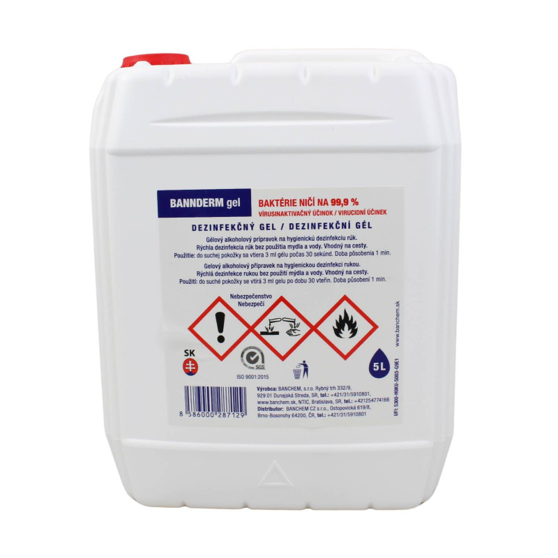 Dezinfekčný gél BANNDERM na ruky 5L Gélový, alkoholový prípravok na hygienickú dezinfekciu rúk. Baktérie ničí na 99,9 %. Moderný spôsob ochrany pracovníkov pred hygienickými rizikami. Vynikajúce riešenie najmä v prípadoch nižšej dostupnosti vody. Vhodný aj do potravinárskeho priemyslu a hygienicky zaťažených prevádzok.  Spektrum účinnosti: baktericídny, fungicídny, vírusinaktivačný (A,V, B) Účinná látka:  propán-2-ol 45g propán-1-ol 30g, 2-fenylfenol 0,45g kvartérne amóniové zlúčeniny C 12-16-alkyl(benzyl)dimetylamónium-chloridy 0,25g Používajte biocídy bezpečným spôsobom. Pred použitím si vždy prečítajte informácie o prípravku na etikete.   Návod na použitie:  Do suchej pokožky sa vtierajú 3ml gélu počas 30 sekúnd. Doba pôsobenia 1 min. Najzávažnejšie nepriaznivé fyzikálno-chemické účinky na ľudské zdravie a na životné prostredie: Veľmi horľavá kvapalina. Spôsobuje vážne poškodenie očí. Môže spôsobiť ospalosť, alebo závraty. Výstražné slovo: Nebezpečenstvo !   Bezpečnostné upozornenia: Uchovávajte mimo dosahu detí. Uchovávajte mimo dosahu tepla, iskier, horúcich povrchov, otvoreného ohňa. Zabráňte vdychovaniu pár. Noste ochranné okuliare. Po zasiahnutí očí niekoľko minút vyplachujte vodou. Nevhodné hasiace prostriedky: silný vodný prúd   Cena je za bal./5L