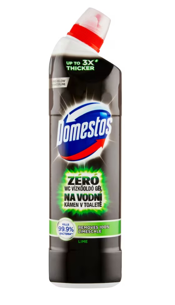Domestos Lime na vodný kameň v toalete je gélový dezinfekčný prípravok na odstraňovanie vodného kameňa v toalete. Udrží sa a pôsobí dlho na zvislom povrchu a dokonca aj pod vodnou hladinou. Toaletu tak precízne vyčistí od vodného kameňa a všetkých baktérií aj v ťažko prístupných plochách. Aplikujte dostatočné množstvo prípravku, aby ste zničili všetok vodný kameň a zabili baktérie v ňom žijúce.