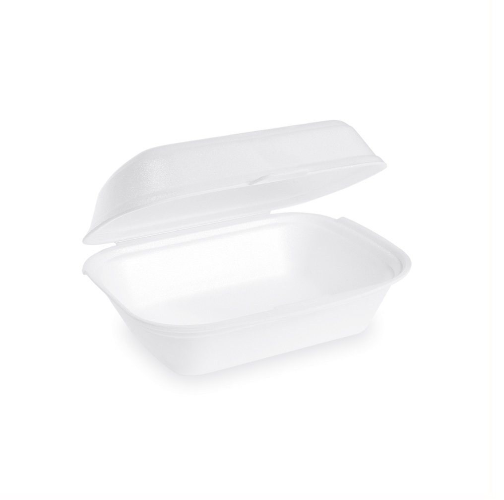 Menu box biely z penového PS s integrovaným viečkom je ideálny na zabalenie obložených alebo zapekaných bagiet alebo hamburgerov.