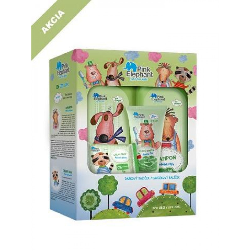 Pink Elephant Darčekový balíček pre chlapcov Pre deti staršie ako 3 roky Obsahuje: Šampón 500ml Pena do kúpeľa 500ml Zubná pasta 50ml Tuhé mydlo 90g