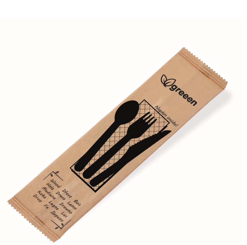 Rozmer: 16,5 cm; Materiál: drevo/papier; Balenie: 50 sád; Set pozostáva: nôž/vidlička/lyžica/obrúsok; Obrúsok: 24×24 cm, dvojvrstvový;