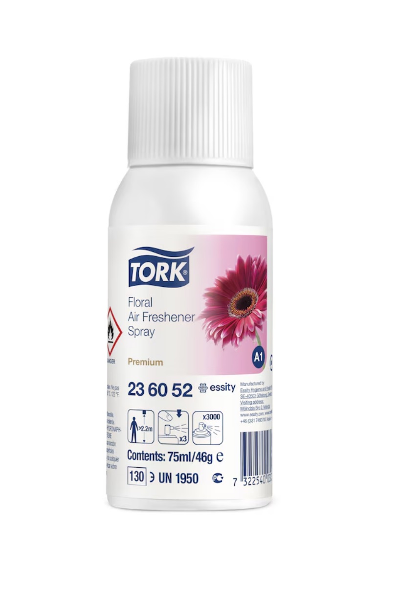 Vôňu vo vašej toalete a umyvárni môžete dôkladne a efektívne kontrolovať vďaka Tork kvetinovej vôni do osviežovača vzduchu. Spreje obsahujú vonné oleje a patentovanú zložku neutralizujúcu zápachy na elimináciu nepríjemných zápachov, a zároveň poskytujú dlhotrvajúci pocit čerstvého vzduchu. Spreje sú vhodné do Tork elektronického osviežovača vzduchu.
