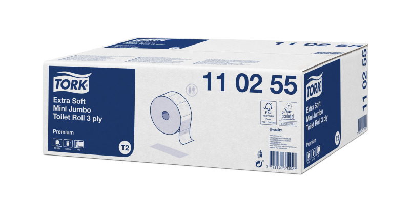 Tork Mini Jumbo extra jemný 3-vrstvový toaletný papier ponúka výnimočný vzhľad a pocit na dotyk spolu s výborným výkonom, a je vhodný do stredne až vysoko frekventovaných prostredí.
