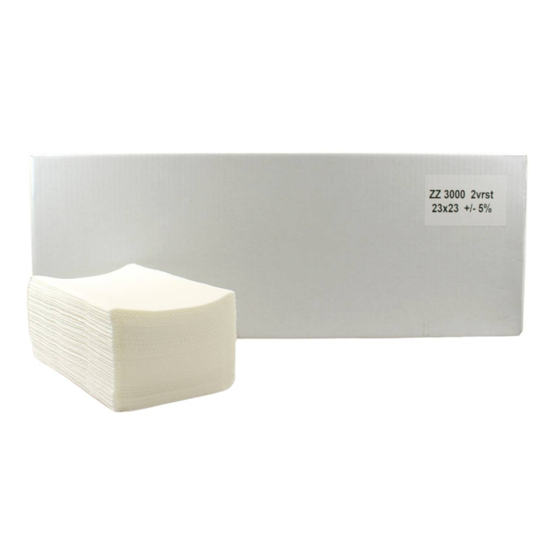 ZZ skladané papierové utierky 100%cel. 2vrst. 22x23cm 3000ks ZZ jemné skladané papierové utierky, 100 % celulóza, 2 vrstvové, balené 20 x 150 ks. Cena za balenie 3000 ks.
